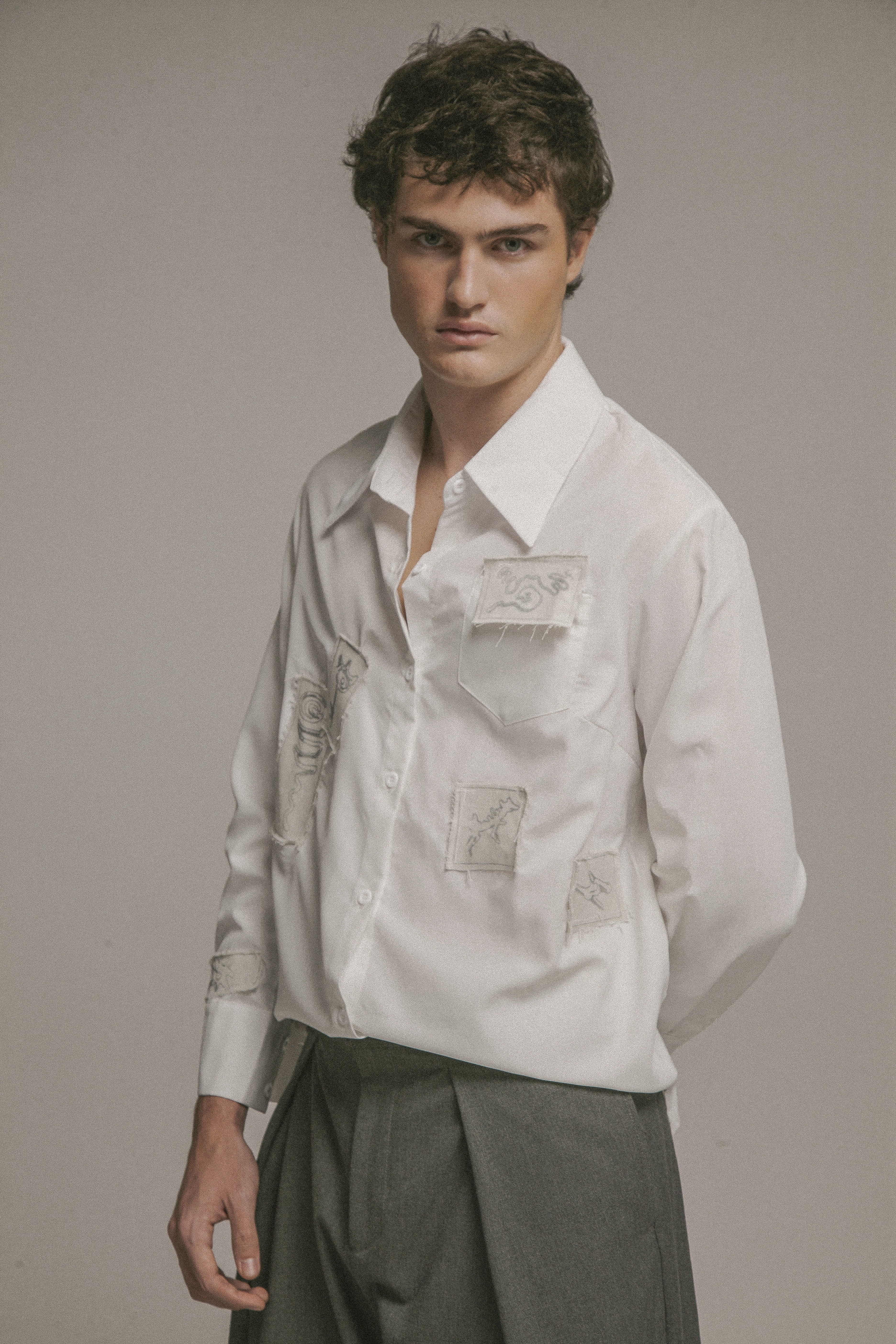 La camisa incorpora parches e ilustraciones iguales a los de la americana, estableciendo una continuidad visual y narrativa entre las prendas del fit.