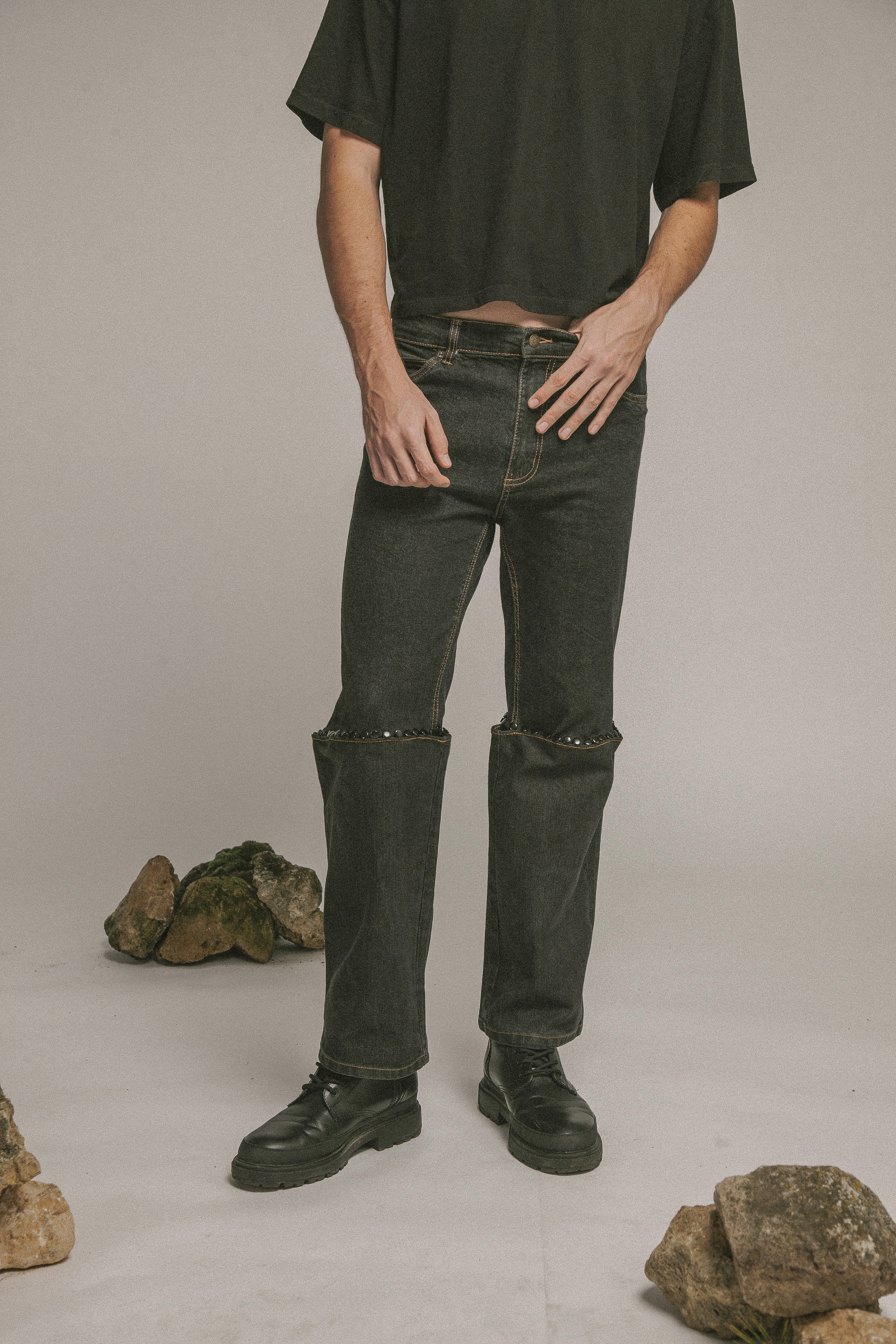 El pantalón vaquero incorpora una apertura regulable desde la rodilla mediante botones, permitiendo adaptar la prenda a distintas condiciones climáticas y de uso.